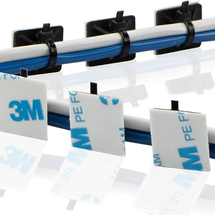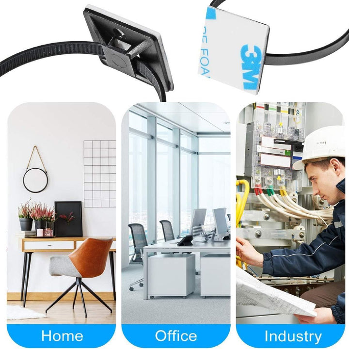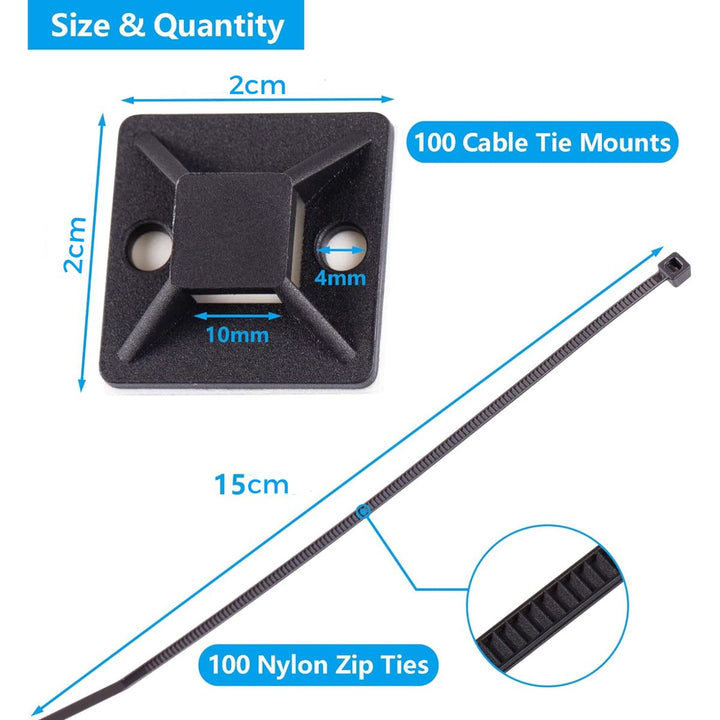 Each set includes 100 self-adhesive mounting bases, 100 8-inch zip ties, and 100 screws-everything you need for neat and secure cable installation at home, in the office, or in your car.