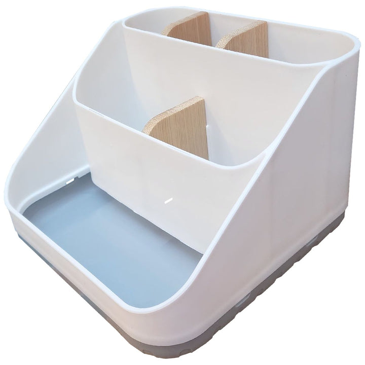 Cart in Mart Large Capacity countertop bathroom orgainzer is designed in 3 rows with 6 slots, elevated by a natural bamboo partition slot for a clean, stylish touch.