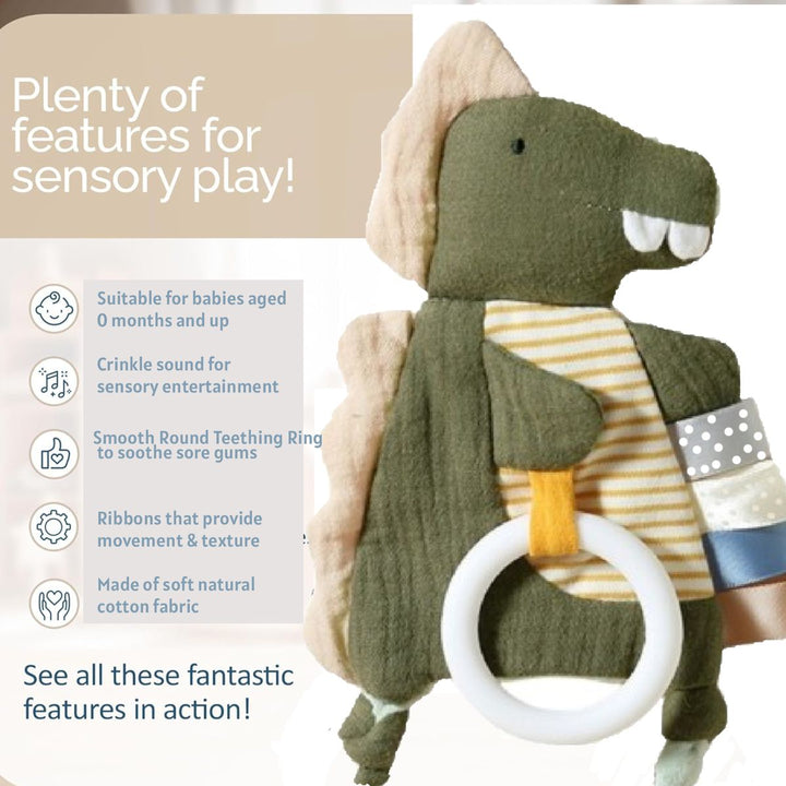This adorable dinosaur features colorful textured ribbons, a soft braided teething ring, and an engaging crinkle sound that encourages sensory exploration and tactile play.